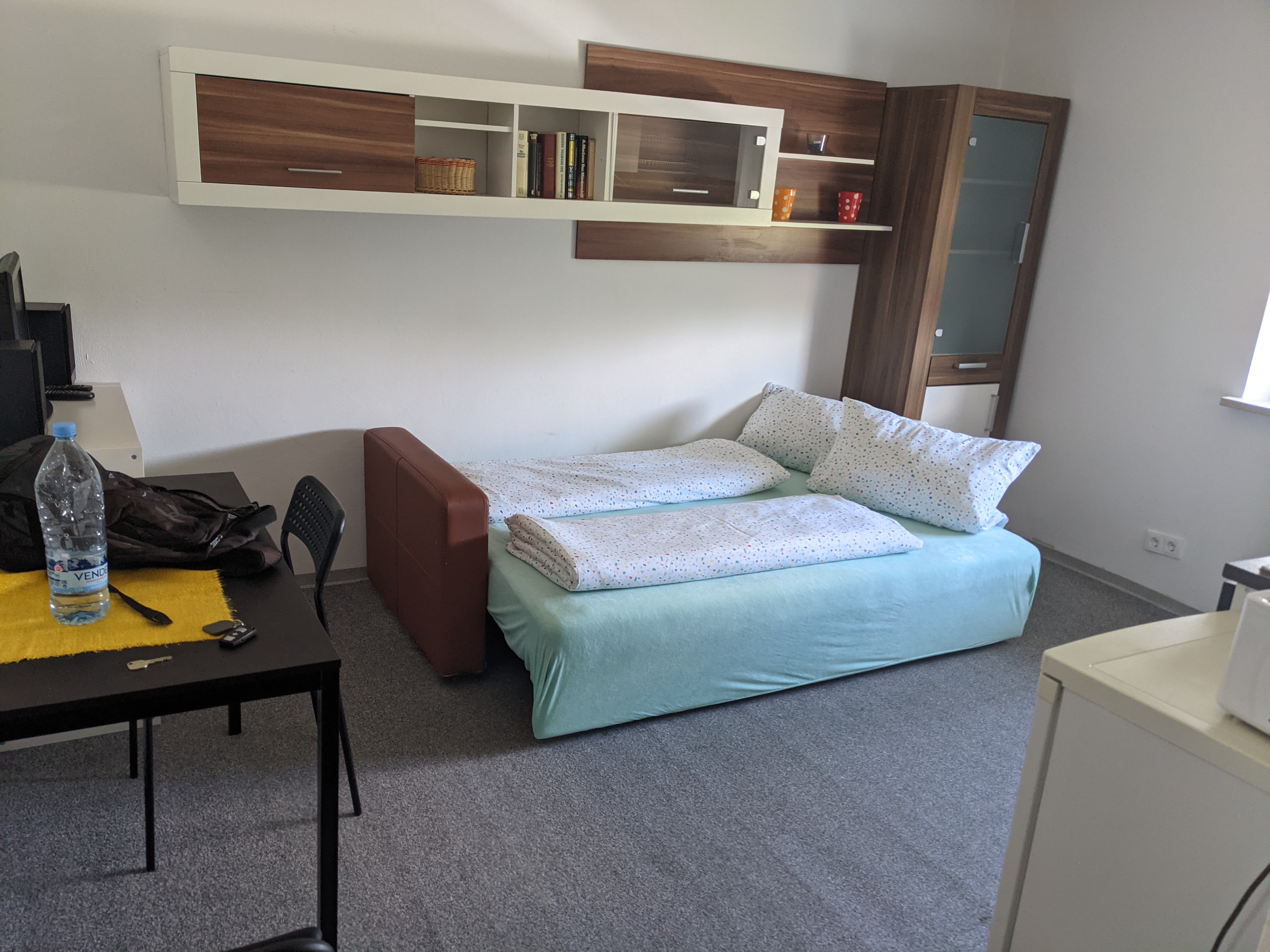 Ieejot iekšā, tīri sakarīgs studio tipa dzīvoklītis, pa 29 eur Vācijā, būs labi, bet viņā bija izteikta Vācijas pedantiskuma garša, it īpaši tualetē kur aizliegts čurāt kājās stāvot. Nemācis man te kā dzīvot, ja vēl vairāk nokaitinās vēl otro ar kājās stāvot mēģināšu (P.S. Tā bija tikai mirkļa joka doma, nevis realitāte).
