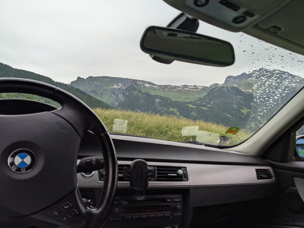 Lai taupītu benzīnu braucot lejā, es būtībā to darīju ieliekot 3 ātrumā un vajadzības gadījumā spiežot bremzi. Ja godīgi visai unikāla pieredze, rēķinot kādā ātrumā likt lai mašīna ripotu uz priekšu, bet ne pārāk ātri. Jo piemēram 2 ātrumā motors smuki bremzē uz 40-45km/h, bet 3 jau ap 65km/h (4. nebija dūšas nevienā vietā likt iekšā). Tā nu ripinoties lejā sāku just, ka kaut kas mazliet sāk smirdēt. Apstādināju mašīnu mazā stāvvietā uz ceļa un jā… bremzes… savā “grudrajā” prātā izlēmu pataustīt un labi apdedzināju vienu pirkstu, bet nu rupji minot ap 250-300 grādiem. Labi lai jau pasēž un atdziest, labā lieta ir tāda, ka lai kur tur Šveicē apstātos, tev būs uz ko skatīties, kamēr biju ticis līdz lejai nācās veikt 3 šādus pitstopus.