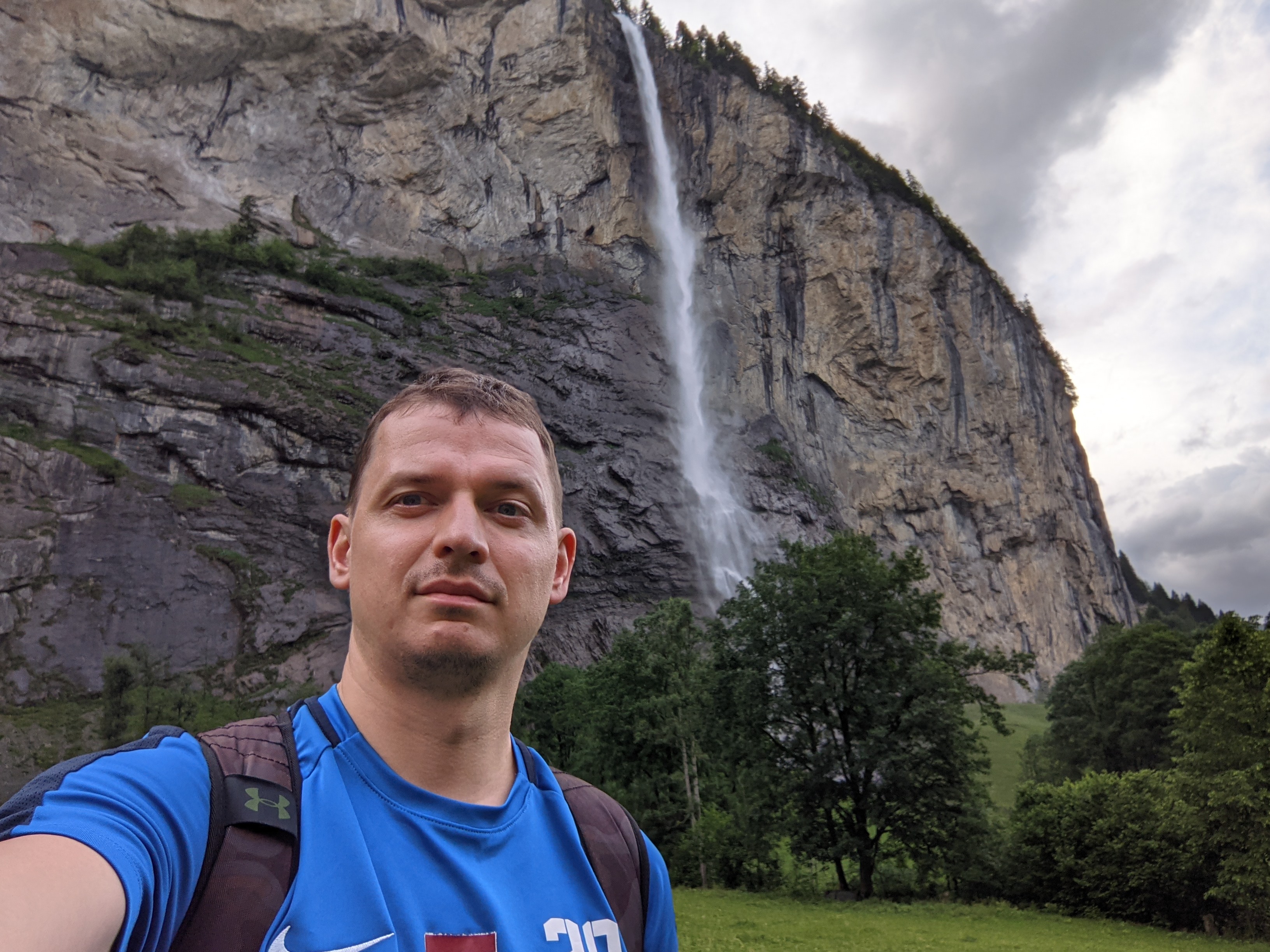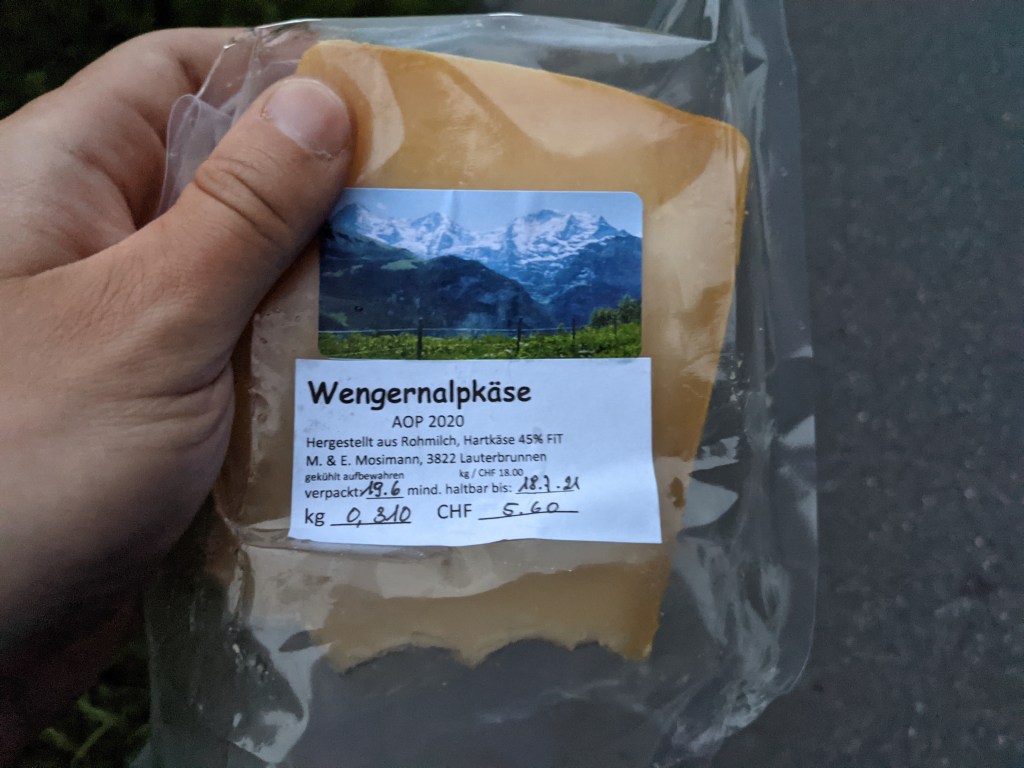 Kā savu pirmo mērķi nostādīju, “Tikt līdz ūdenskritumam un pieskarties viņam”, bet ātri vien uzzināju, ka šajā vietā tas laikam nebūs baigi iespējams. Īsti nekur nevar tikt klātī pie klintīm, viss ir vienos žogos un apzīmēts ar zīmītēm, ka ja pieiešu pārāk tuvu mani nositīs kāds krītošs akmens. Labi sīkumi ejam vienkārši pastaigā. Tā nu vienkārši izvēlējos taku un devos taisni, īsti nekad neskatītamies uz priekšu, bet pārsvarā tik ar atvēru muti un uz augšū. Pēc kādiem 3 km un apmēram vienas stundas, sāku just mazas sāpes plecos un izsalkumu vēderā. Apsēdos uz ietves malas ieēdu cepumus, bet muguras sāpes īsti nepārgāja. Kā jau vienmēr “Sīkums, domāsim par to vēlāk”. Ejot uz priekšu izgāju cauri mazam mežiņam, salaustam tiltiņam un nogāju garām vairākiem ūdenskritumiem, līdz izlēmu, ka laiks tomēr doties atpakaļ. Plecu sāpes gan sāka tikai ņemties spēkā un būtībā sapratu, ka muguras soma kas man šobrīd ir ir vienkārši metama miskastē, bet nu pagaidām jādzīvo ar to kas ir. Kad biju 2 km attālumā no savas naktsmītnes, ceļa malā pamanīju ko interesantu. Automātisko tirdzniecības automātu kas pardo sieru. Esmu Šveicē, jāizmēģina. Pa 6.40 CHF (6 eur) nopērku īstu Alpu siera gabalu un turpinu ceļu mājās. Siers… bija okey… sākumā likās tīri labs, bet jo vairāk ēdu, jo mazāk viņš sāka garšot.