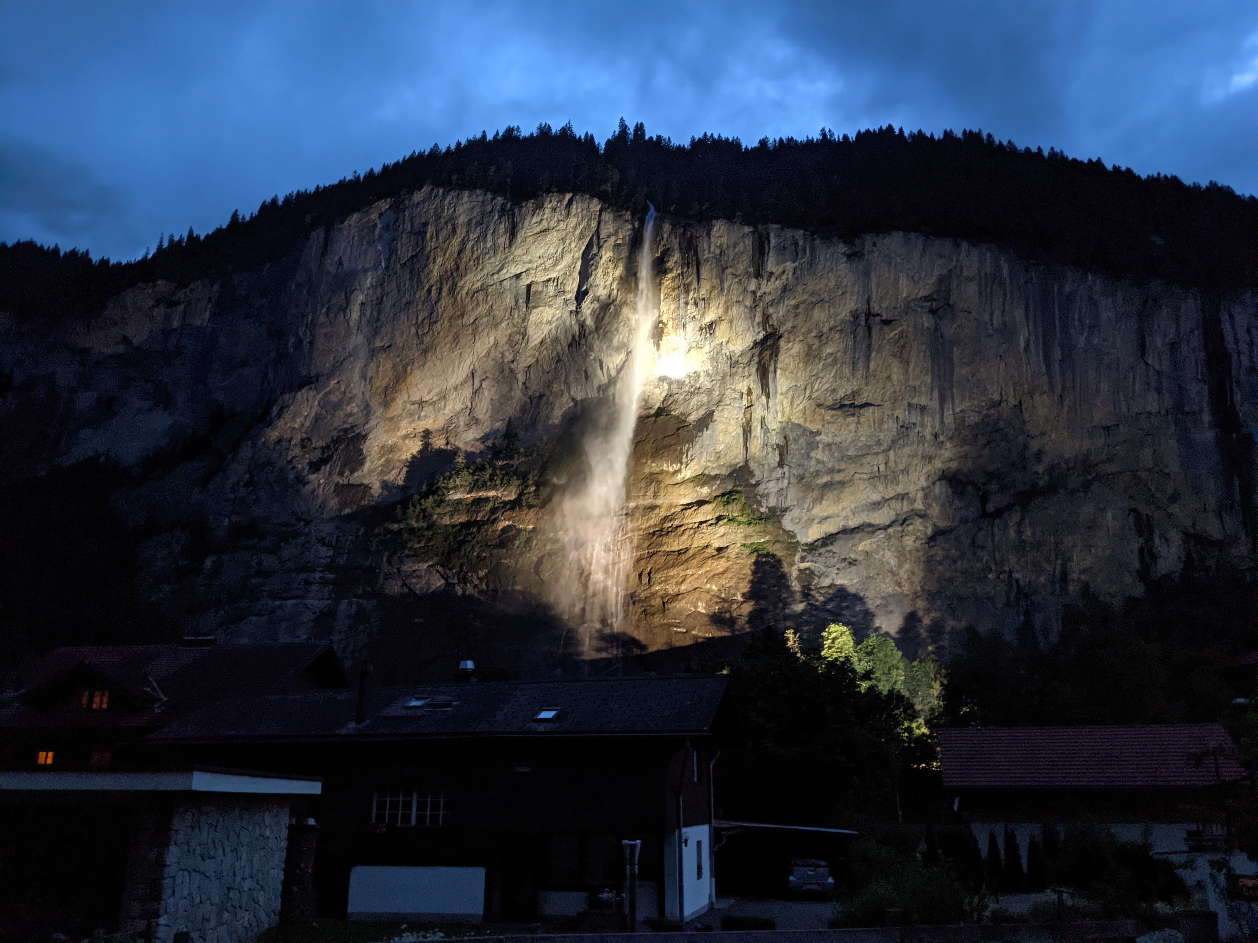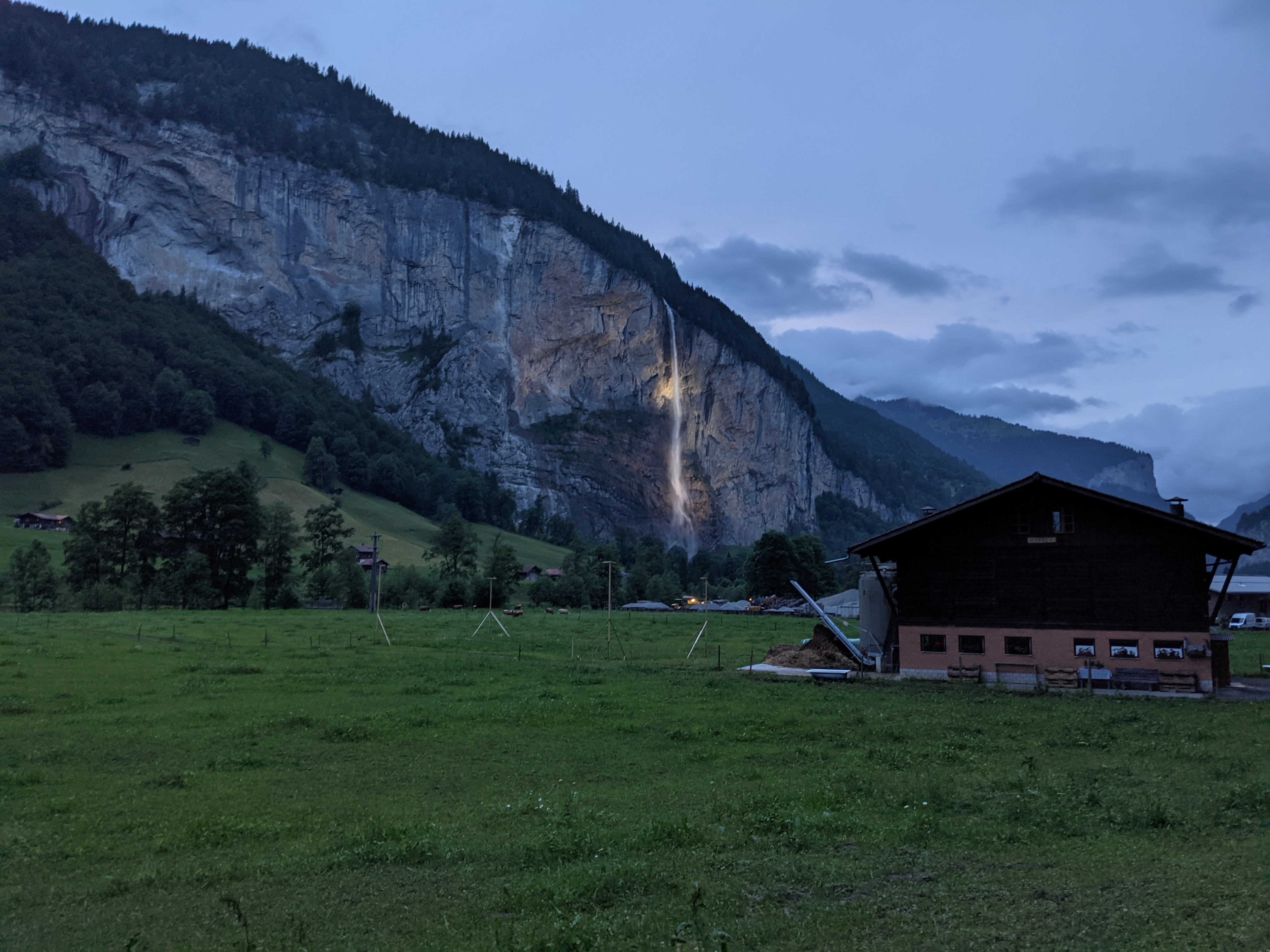 19:45 kamēr atradu precīzo naktsmītnes vietu pagāja kāds laiciņš, jo norādītā adrese vai mapes informācija bija pilnīgi ačgāna, bet nu Lauterbrunnen ir vienkārši pasakaini skati.